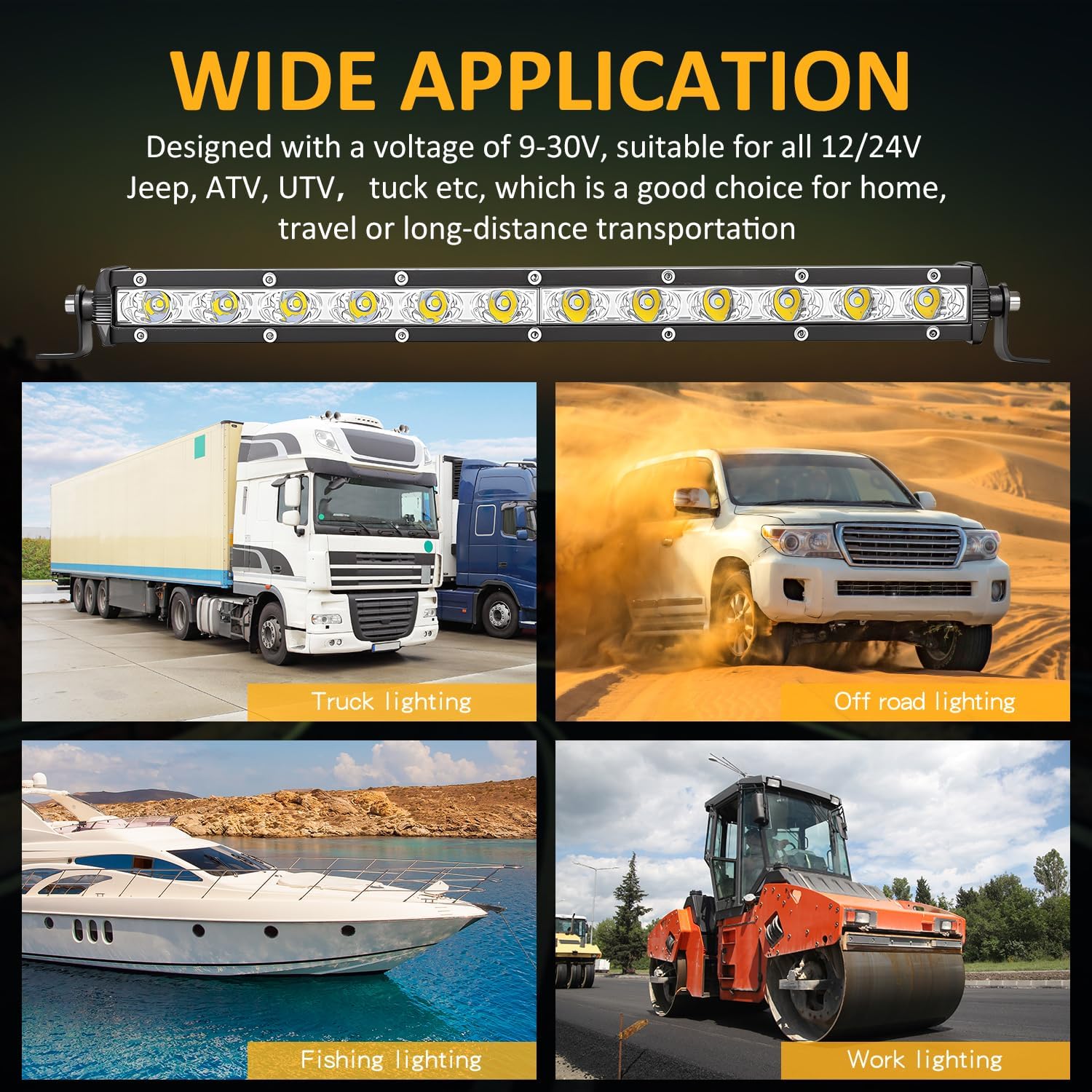 - Multi Functions: The ultra slim light operates within a DC 10V-30V voltage range, can be mounted either on the bumper as a bumper light, behind the grille for a headlight, rear bumper as a reverse/backup light, or on the hood, roof rack, motorcycle, dirt bike, boat, RV, mower,etc
